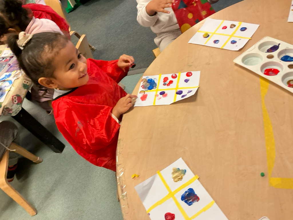 In Maths we have been continuing our work on pattern and colour. We started with a fun colour sorting activity, choosing a plant pot and finding all the pompoms that were the same colour as the butterfly on the pot. It was a bit tricky to pick up the pompoms with the tweezers but we used our resilience and kept trying. The pompoms also ended up on a floor a lot, but many of our children showed respect for the nursery environment by helping the adults to pick them up.
